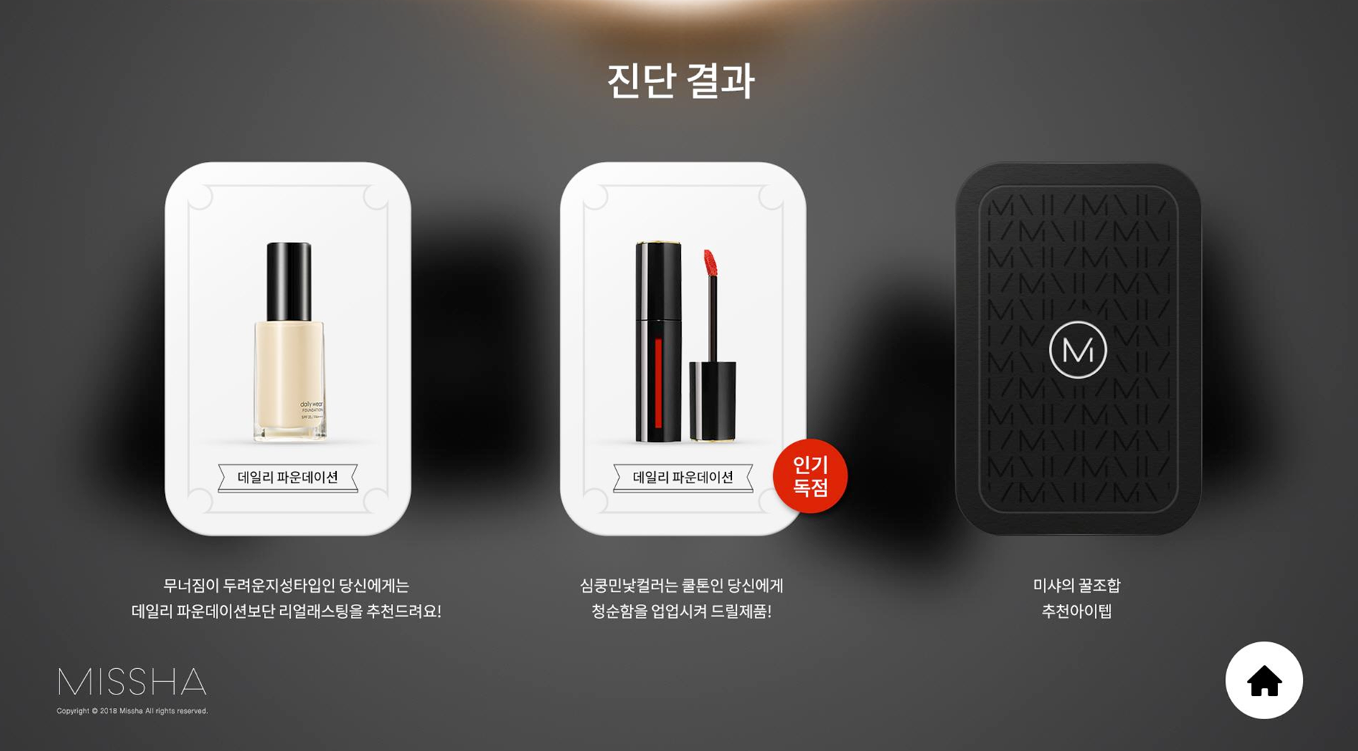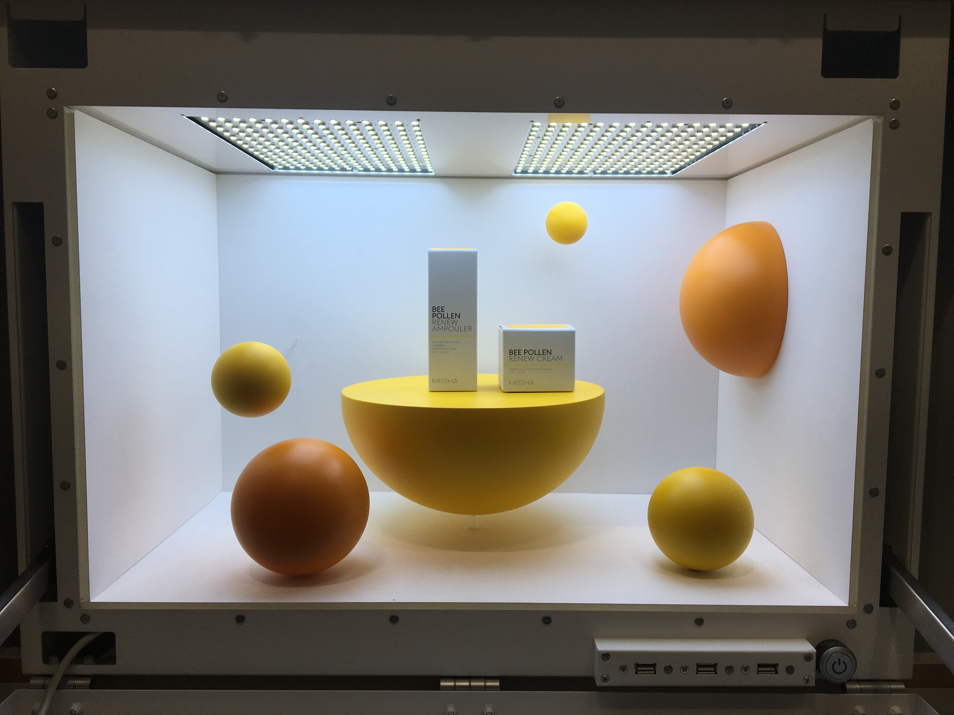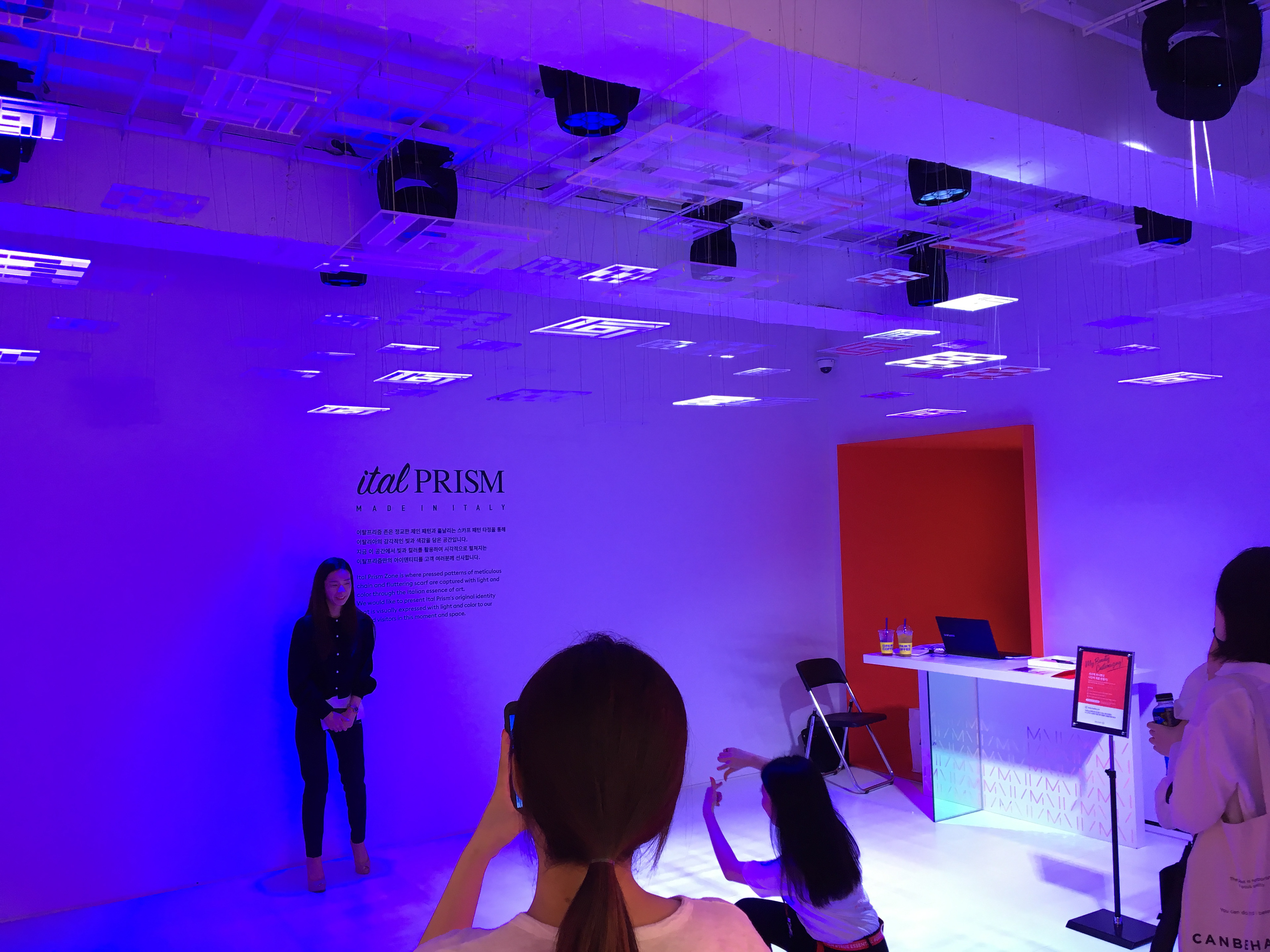 MISSHA의 이탈프리즘 제품을 모티브로한 제품 조형물을 제작하여 천정에 설치, 조명의 빛을 굴절시켜 다채로운 빛과 색상을 강조하여 포토제닉한 공간을 연출하였습니다.