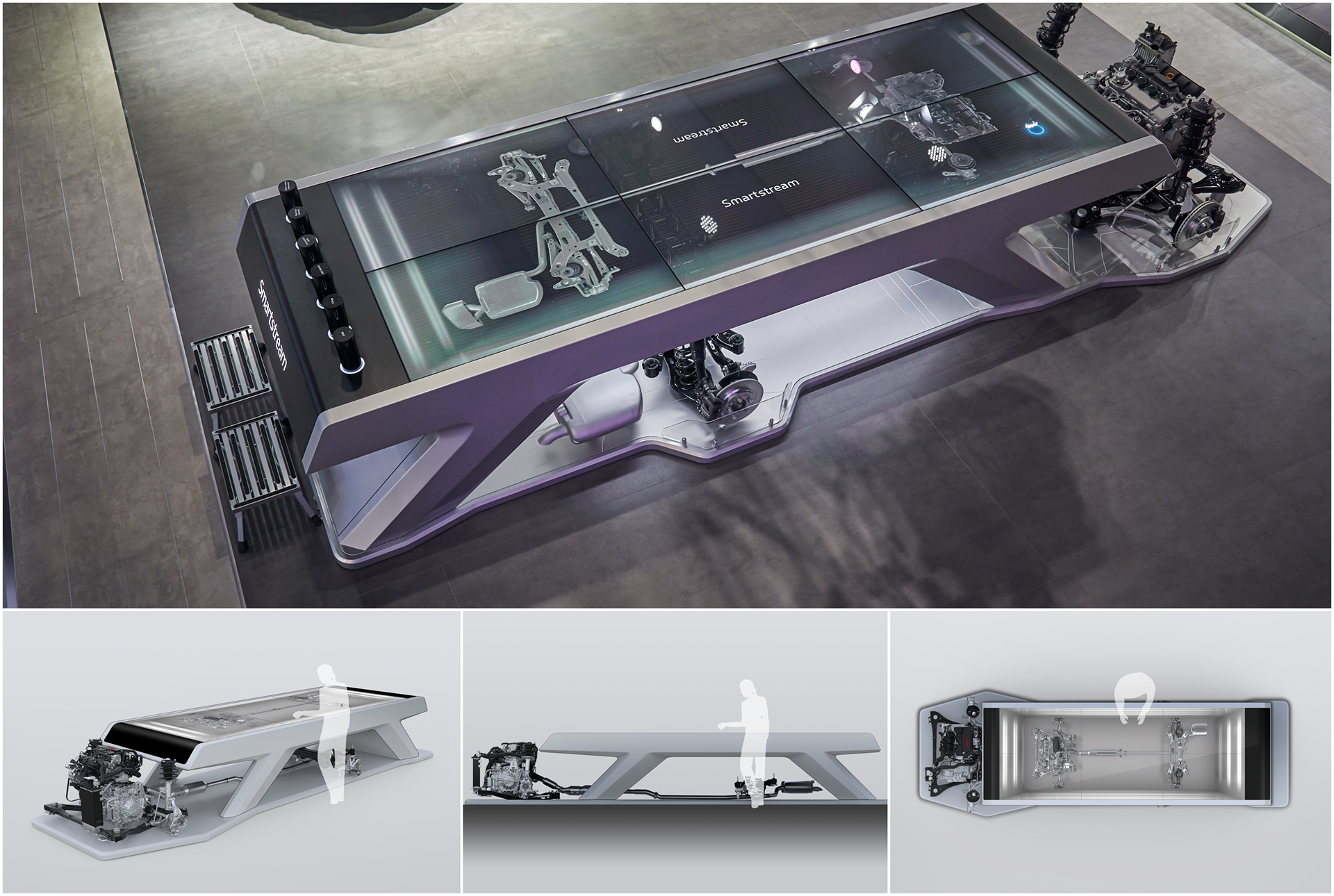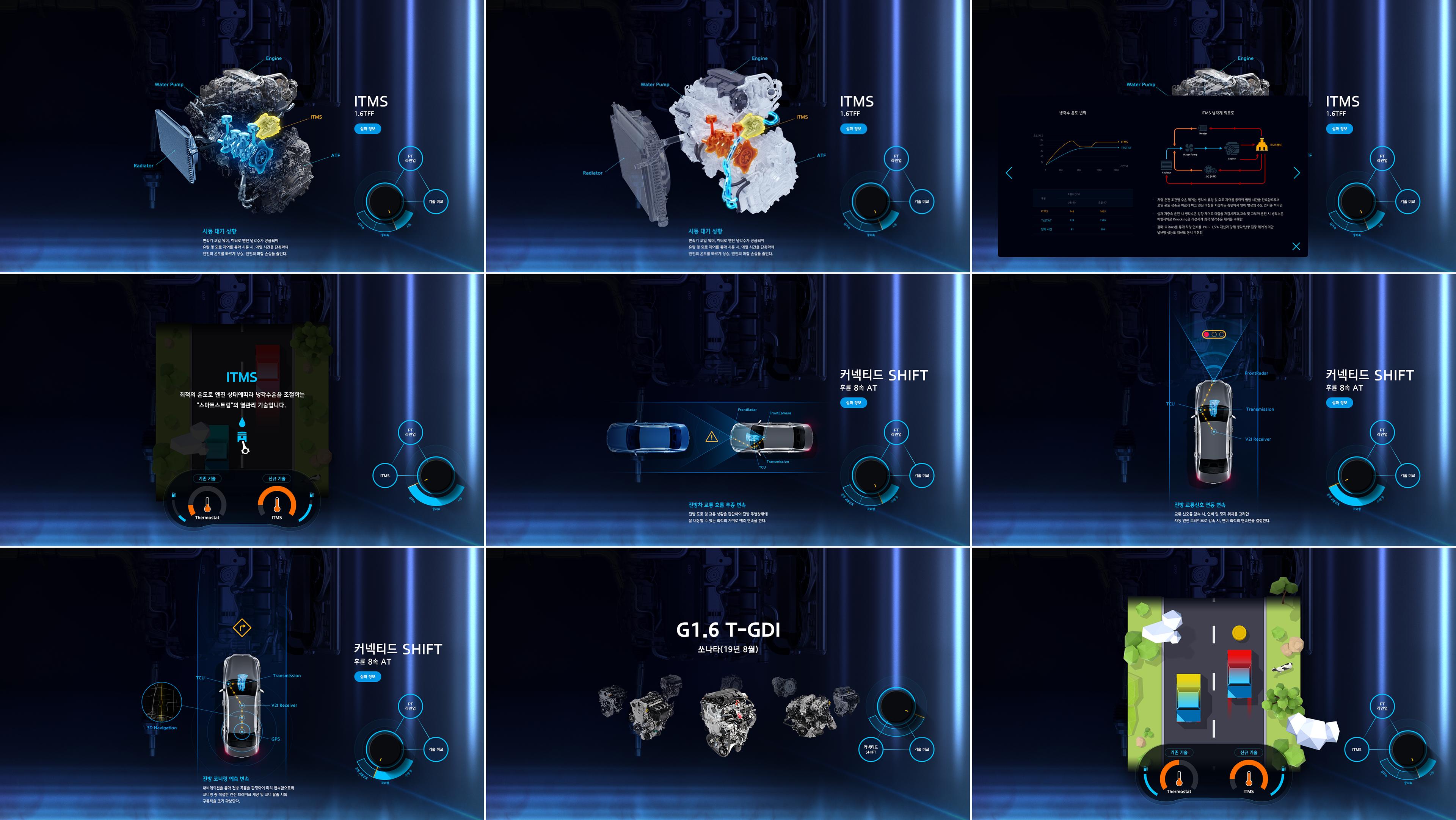 HMG는 3세대 파워트레인의 다양한 기술력을 효과적으로 전달하고, 스마트스트림 브랜드 이미지와 인지도를 상승시키기 위해 체험형 전시물을 계획하였습니다. VINYL-IX는 프로젝트 목적을 반영한 이동이 용이하고 임팩트 있는 형태의 미디어 테이블 형태를 설계하였습니다. 또한 집중도와 몰입감 있는 체험을 위해 사물을 이용한 인터렉션 방식과 UX/UI를 단순화 하였습니다.