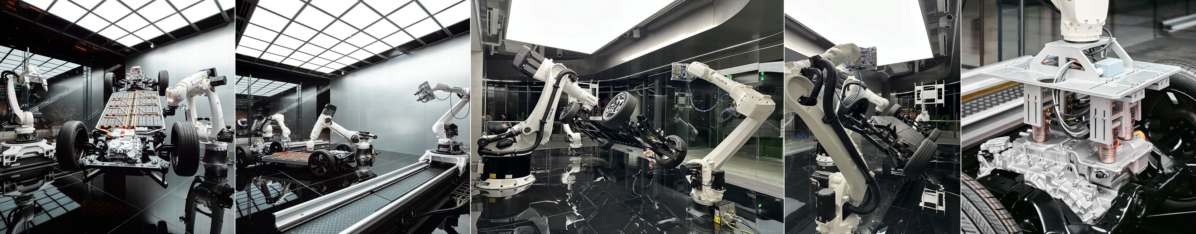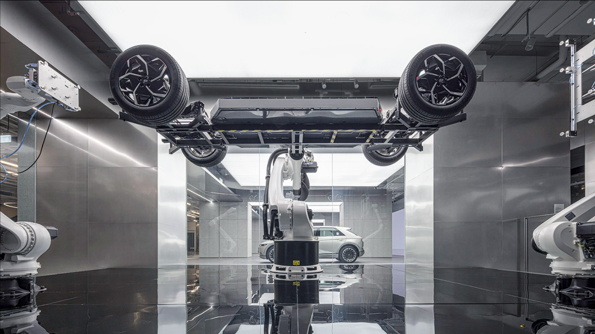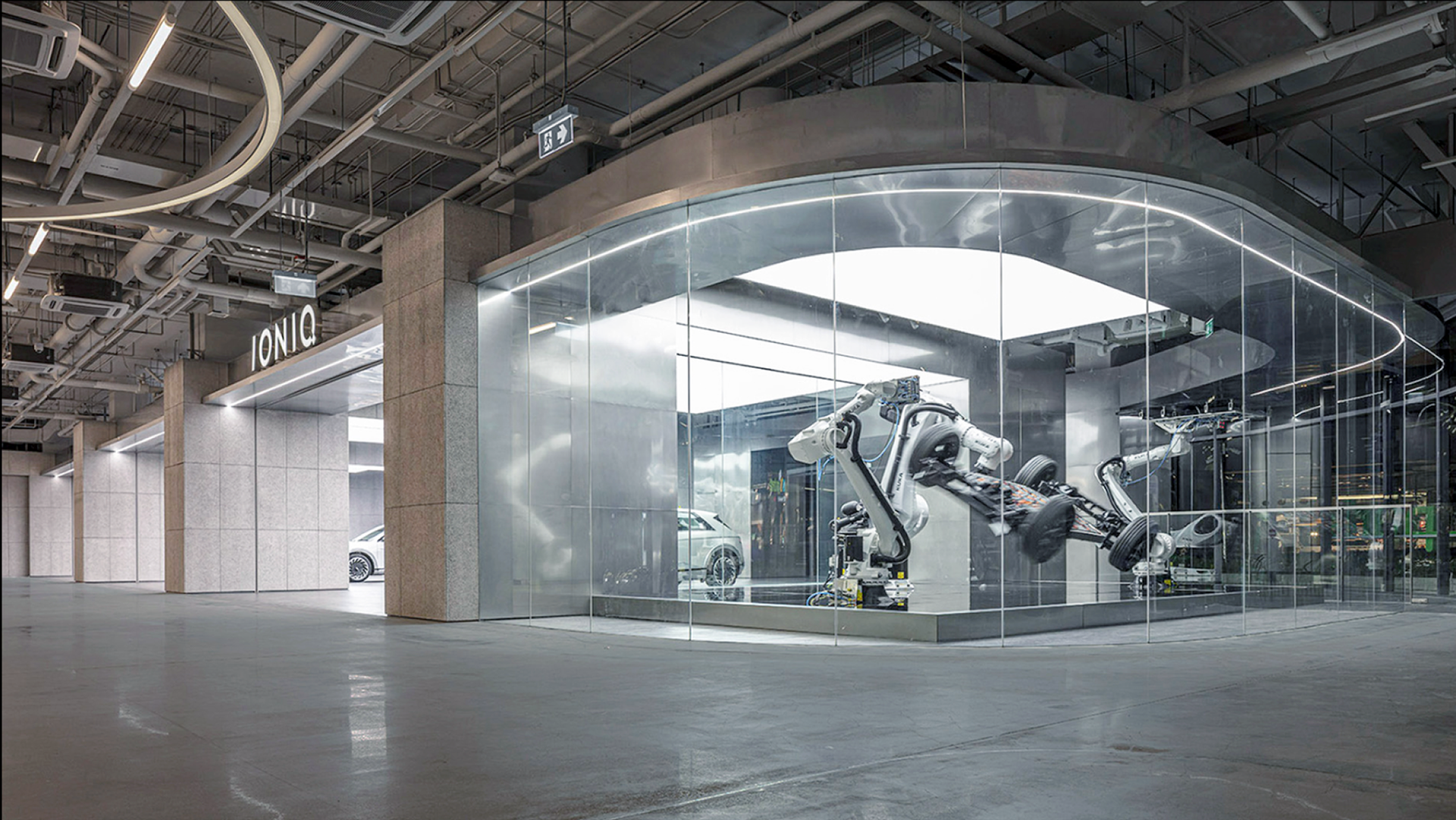 IONIQ에 공통적으로 적용되는 글로벌 모듈 플랫폼(Global Module Platform) 을 주제로, 세 대의 로봇암이 정교하게 움직이며 조명과 음향이 어우러지는 아트 퍼포먼스 공간을 연출합니다.