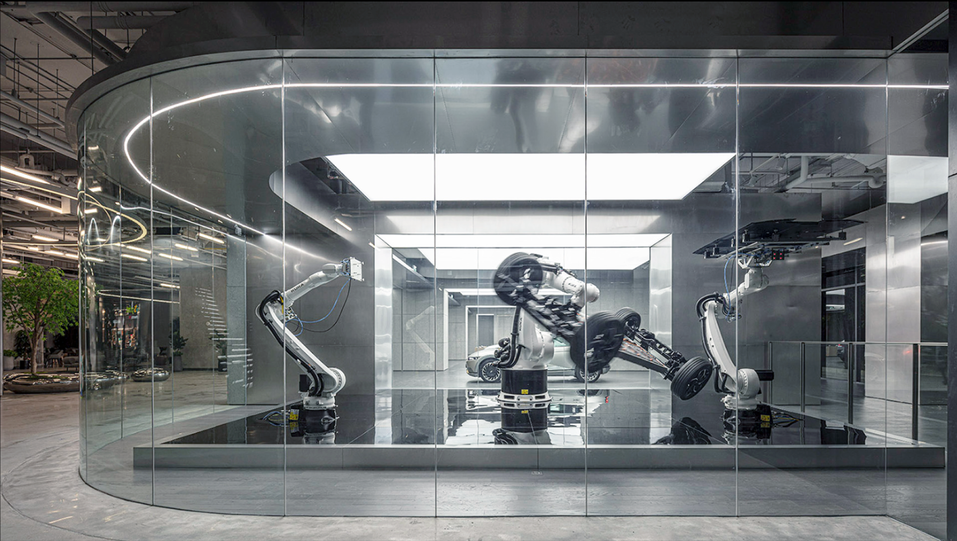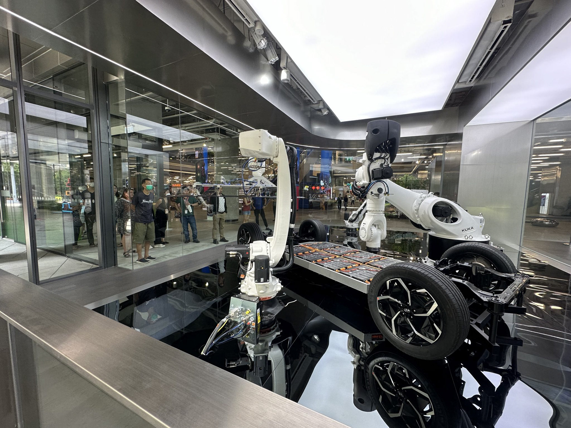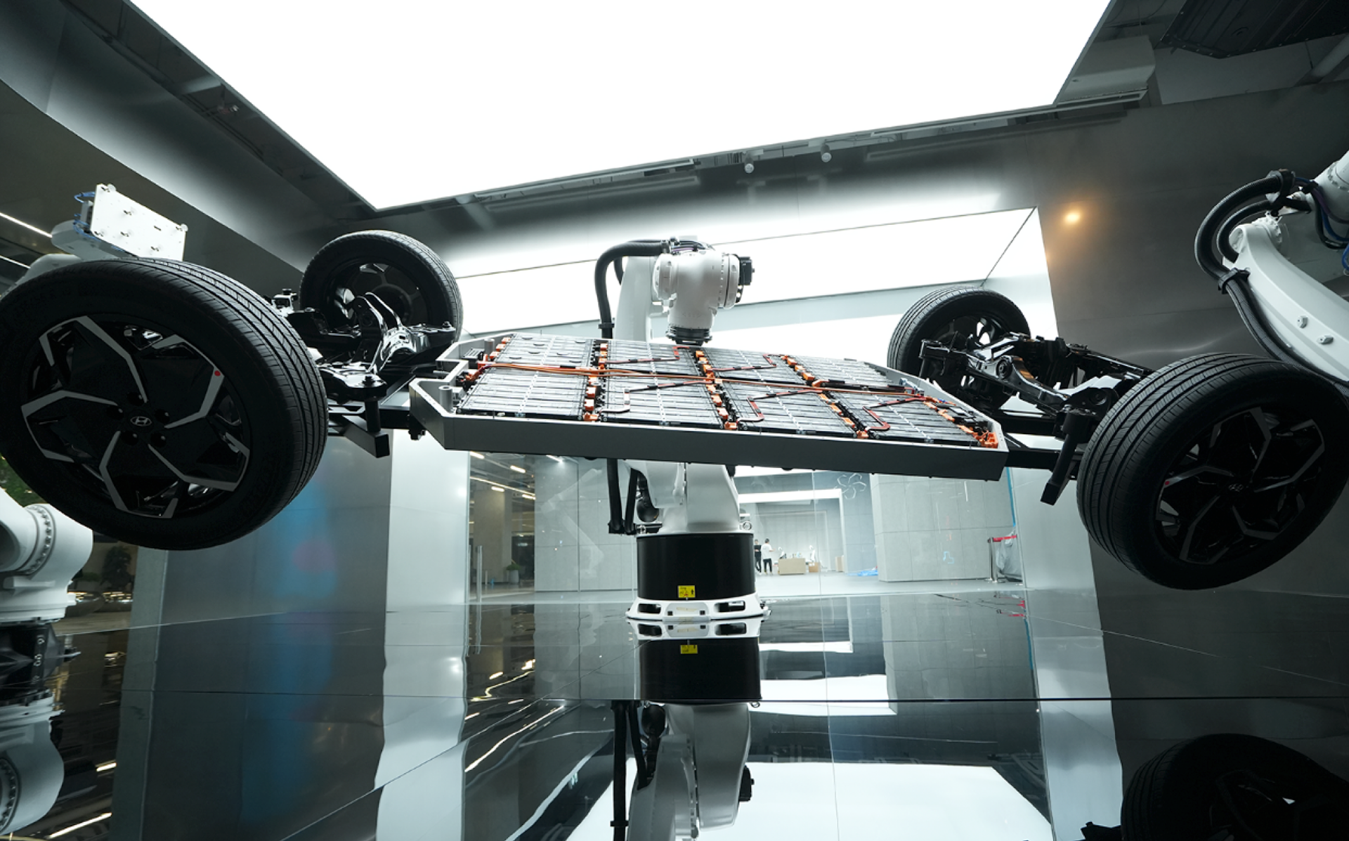 IONIQ에 공통적으로 적용되는 글로벌 모듈 플랫폼(Global Module Platform) 을 주제로, 세 대의 로봇암이 정교하게 움직이며 조명과 음향이 어우러지는 아트 퍼포먼스 공간을 연출합니다.