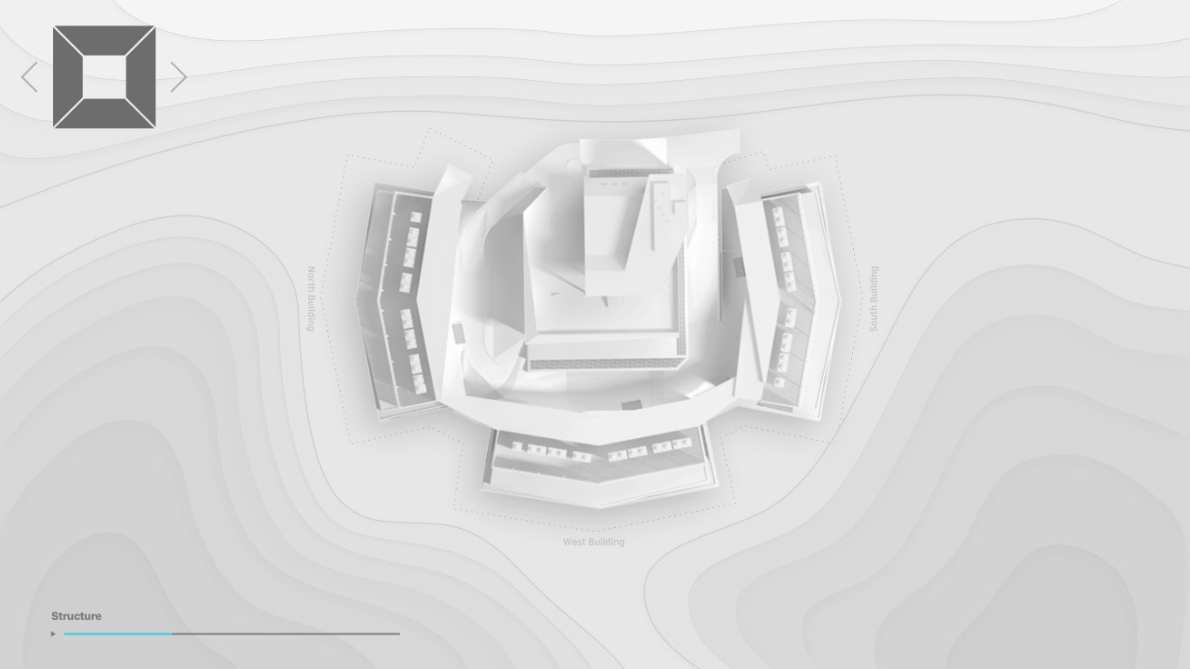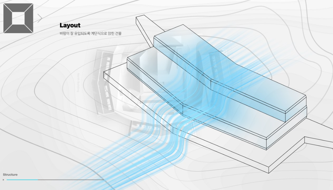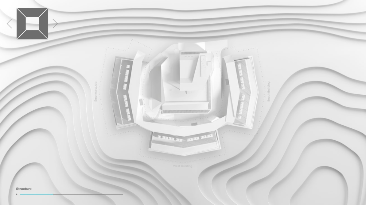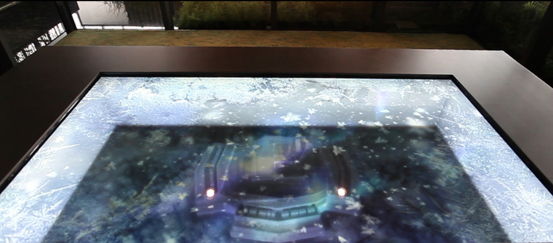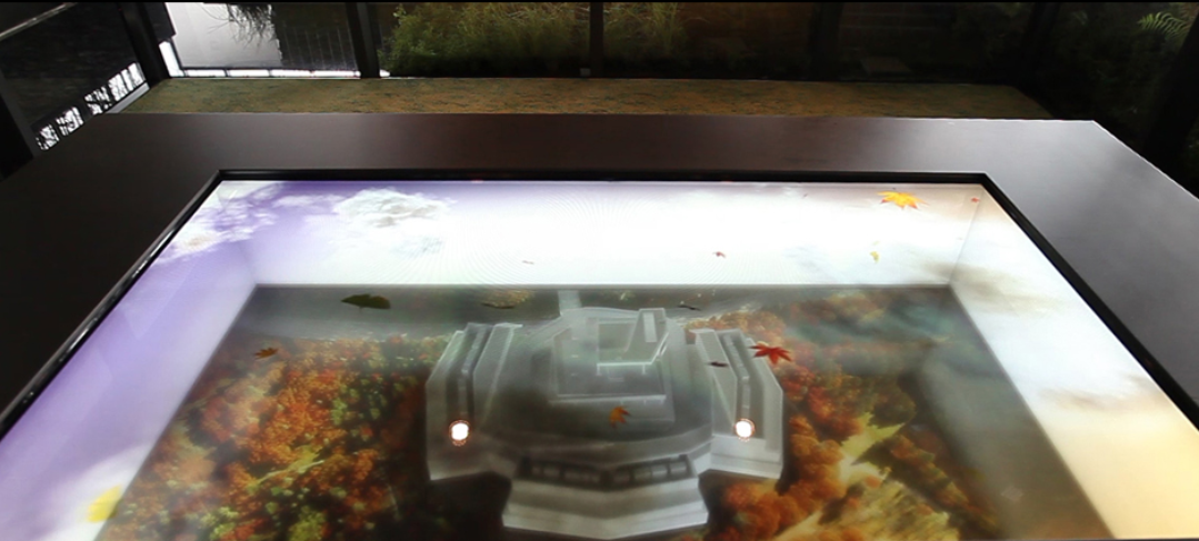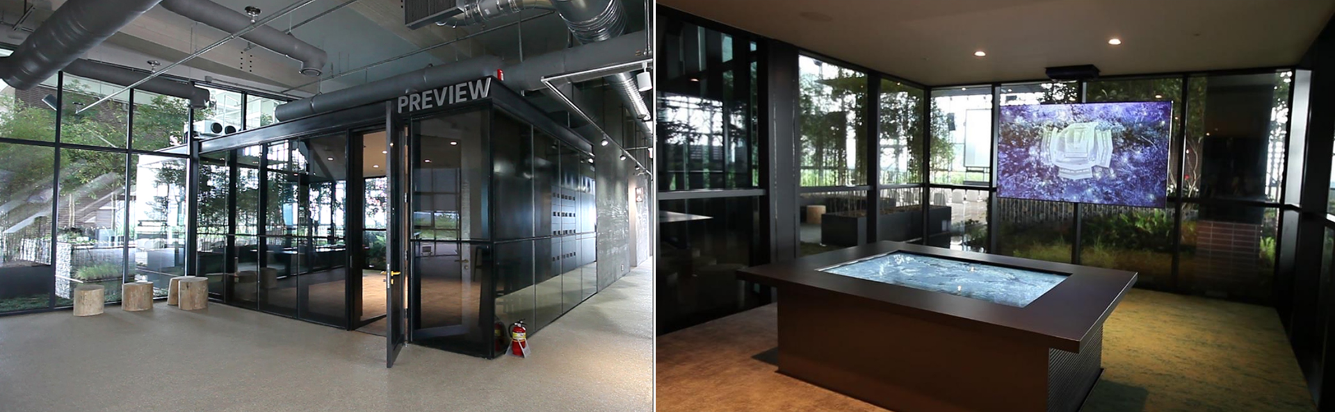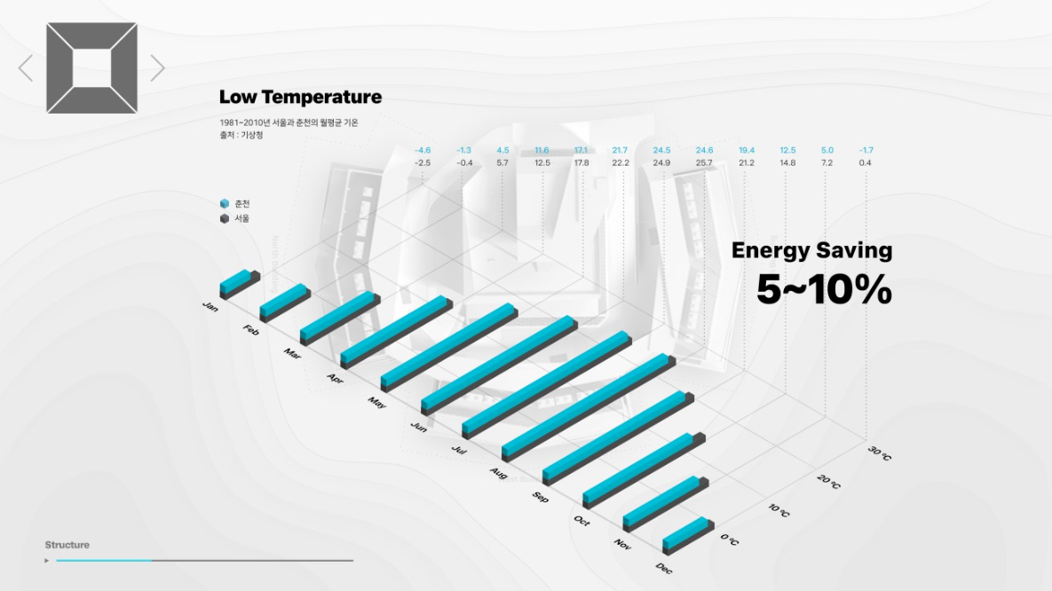 '각' 조감도 모형과 레이어드 된 투명 모니터에서 소개되는 '각' 춘천의 시설정보와 설비들 그리고 계절별 '각' 춘천의 모습의 모션 그래픽 영상은 방문객들에게 다양한 스토리를 전달합니다.