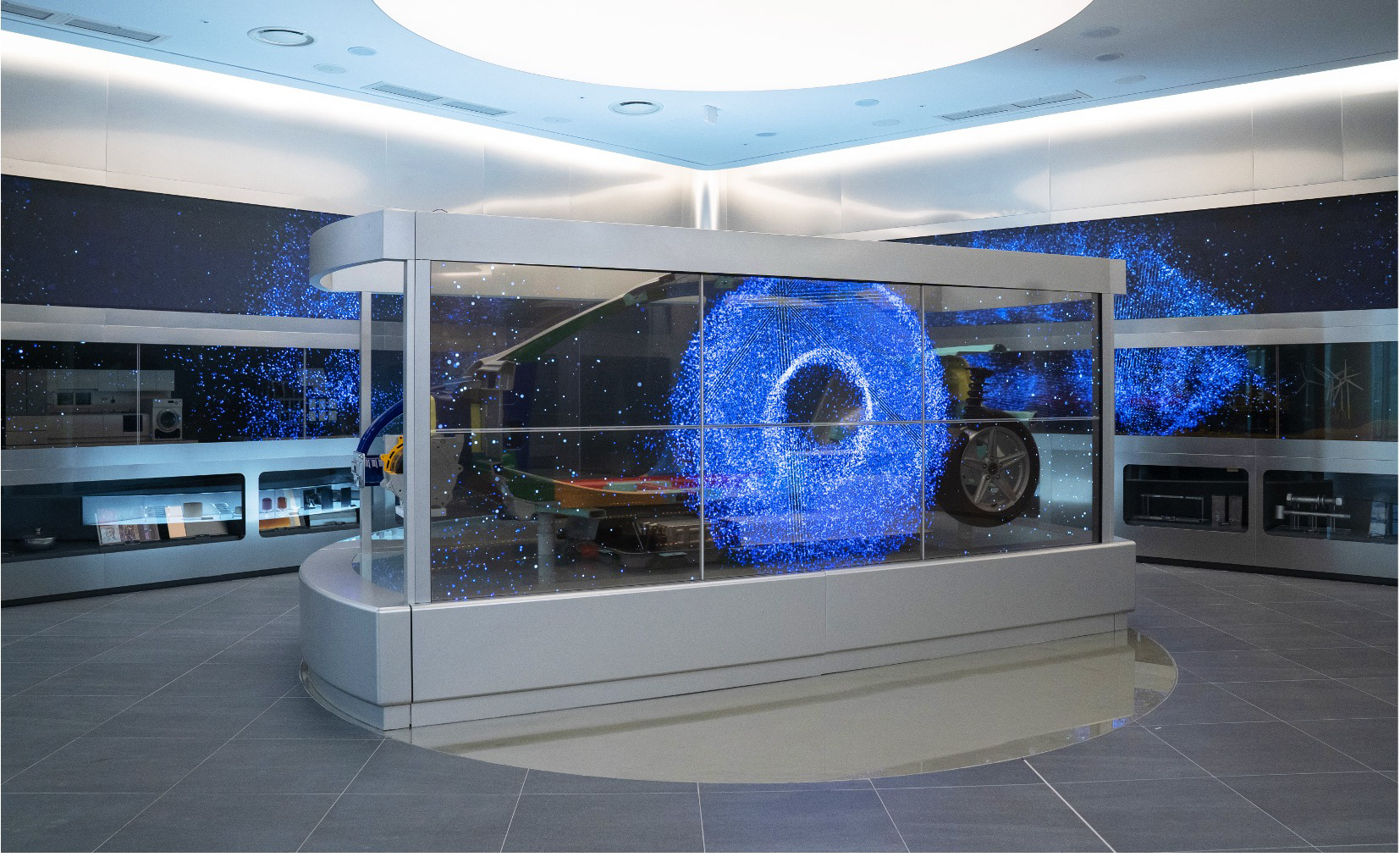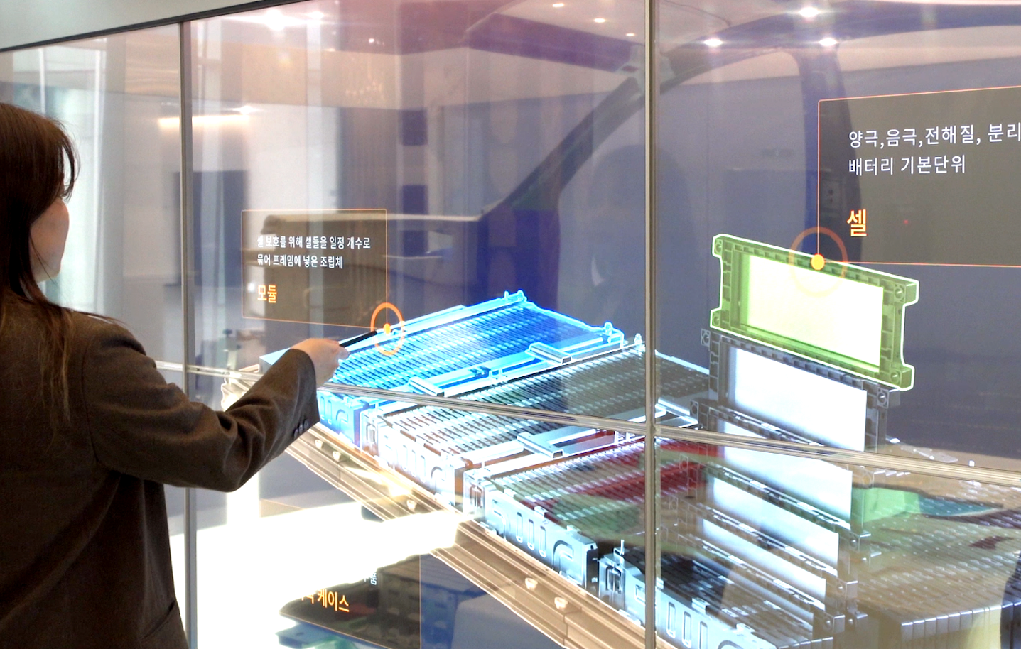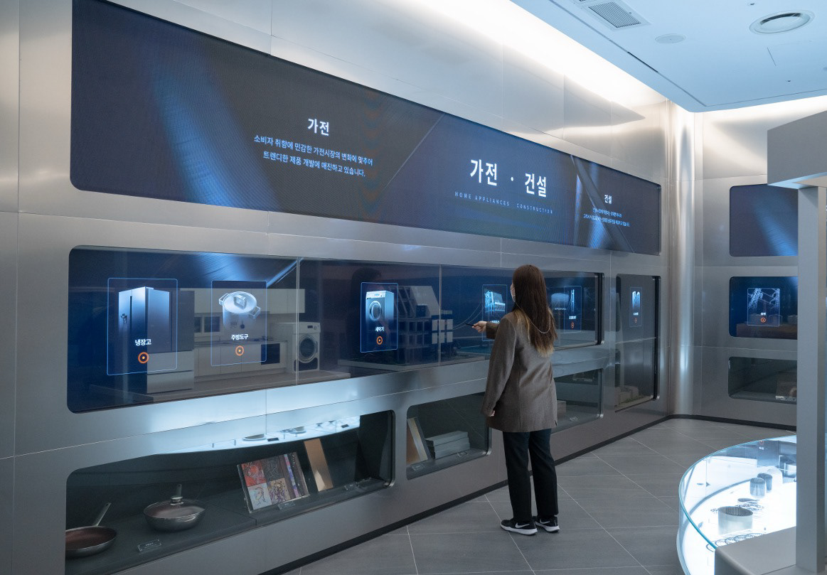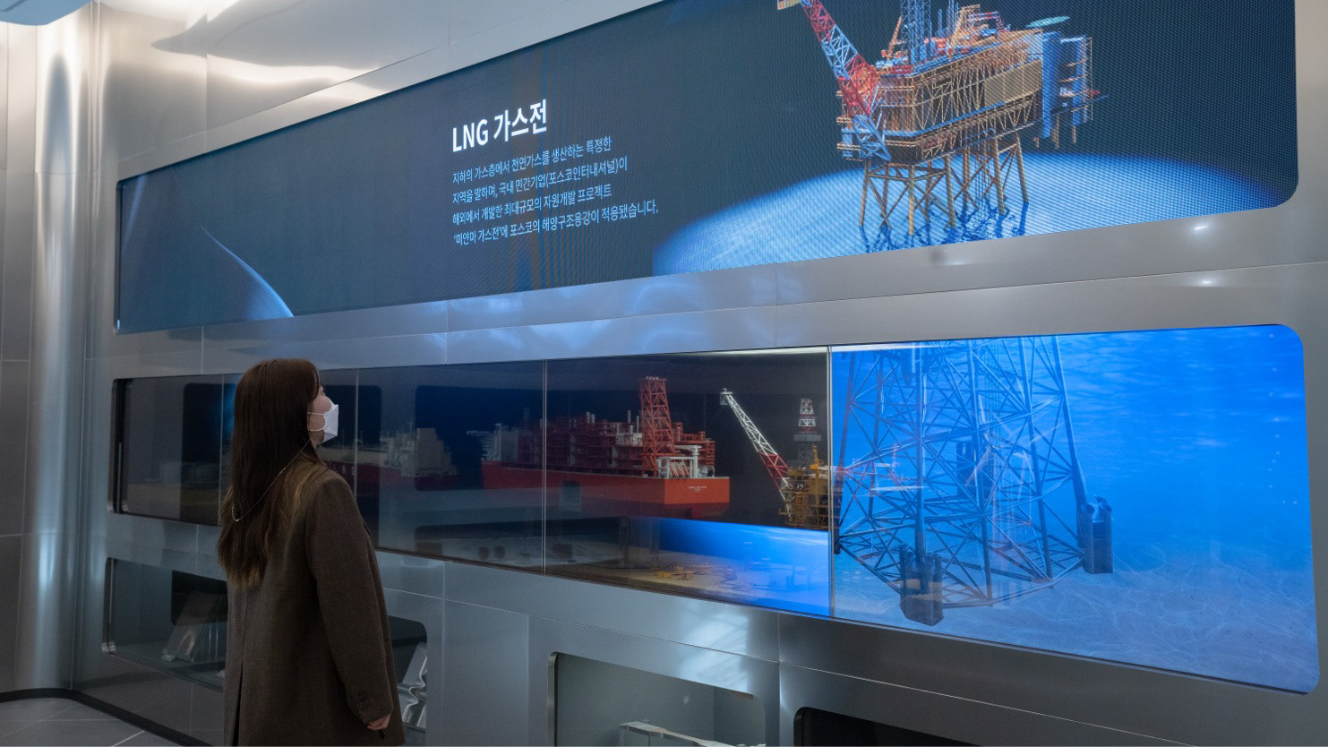 포스코에서 생산되는 다양한 제품들의 설명과 적용 사례들을 정보 및 영상 컨텐츠로 제작하여 투명디스플레이와 LED를 통해 방문객에게 설명하는 공간입니다.