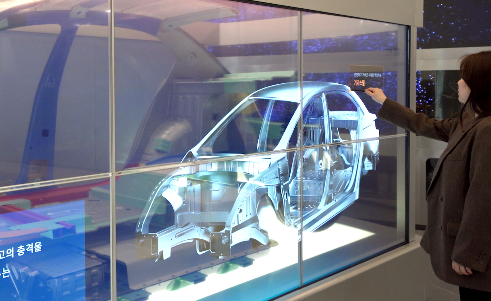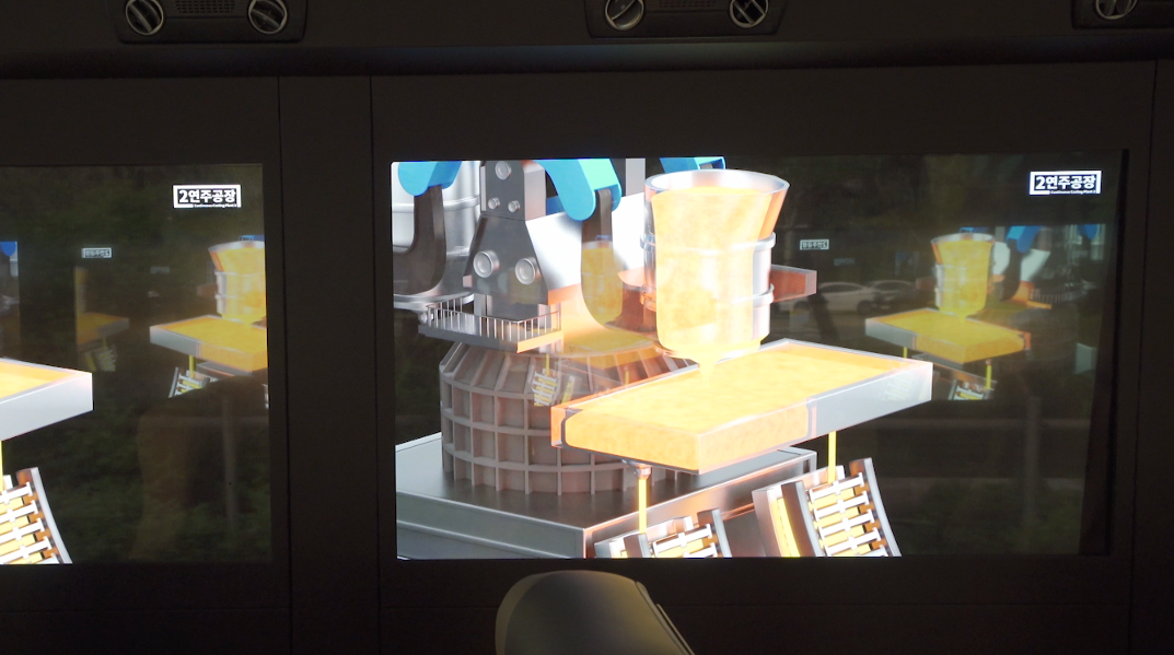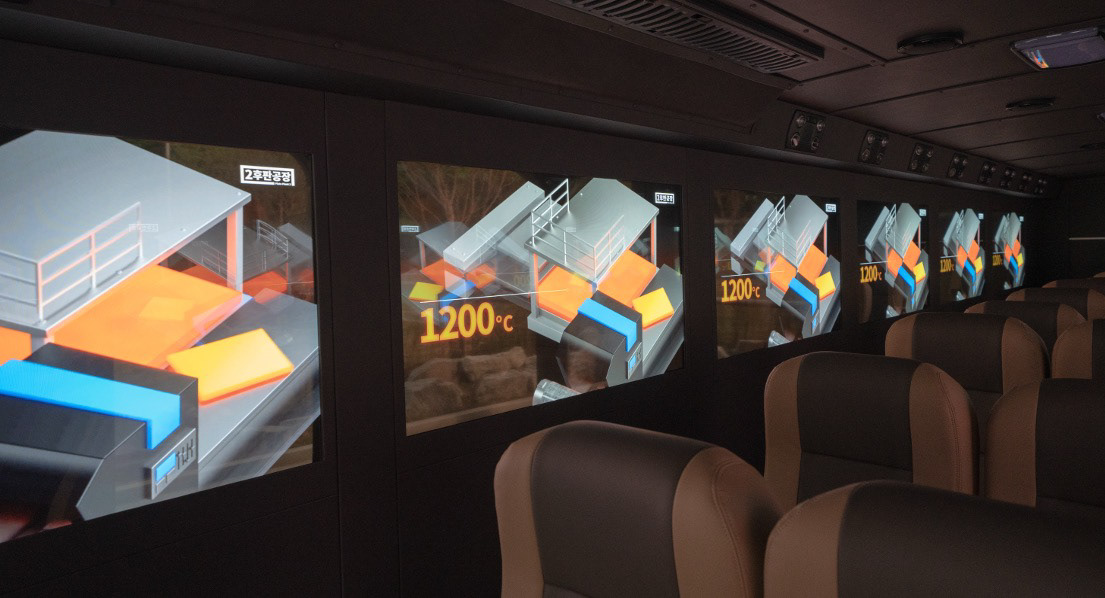 견학이 어려운 제철소 내부 시설들을 영상 컨텐츠로 제작하여 이동하는 버스에 설치된 투명디스플레이를 통해 가상으로 견학할 수 있게 하였습니다.
