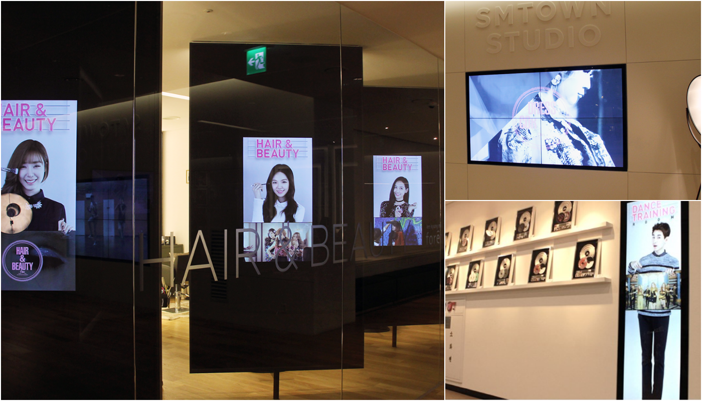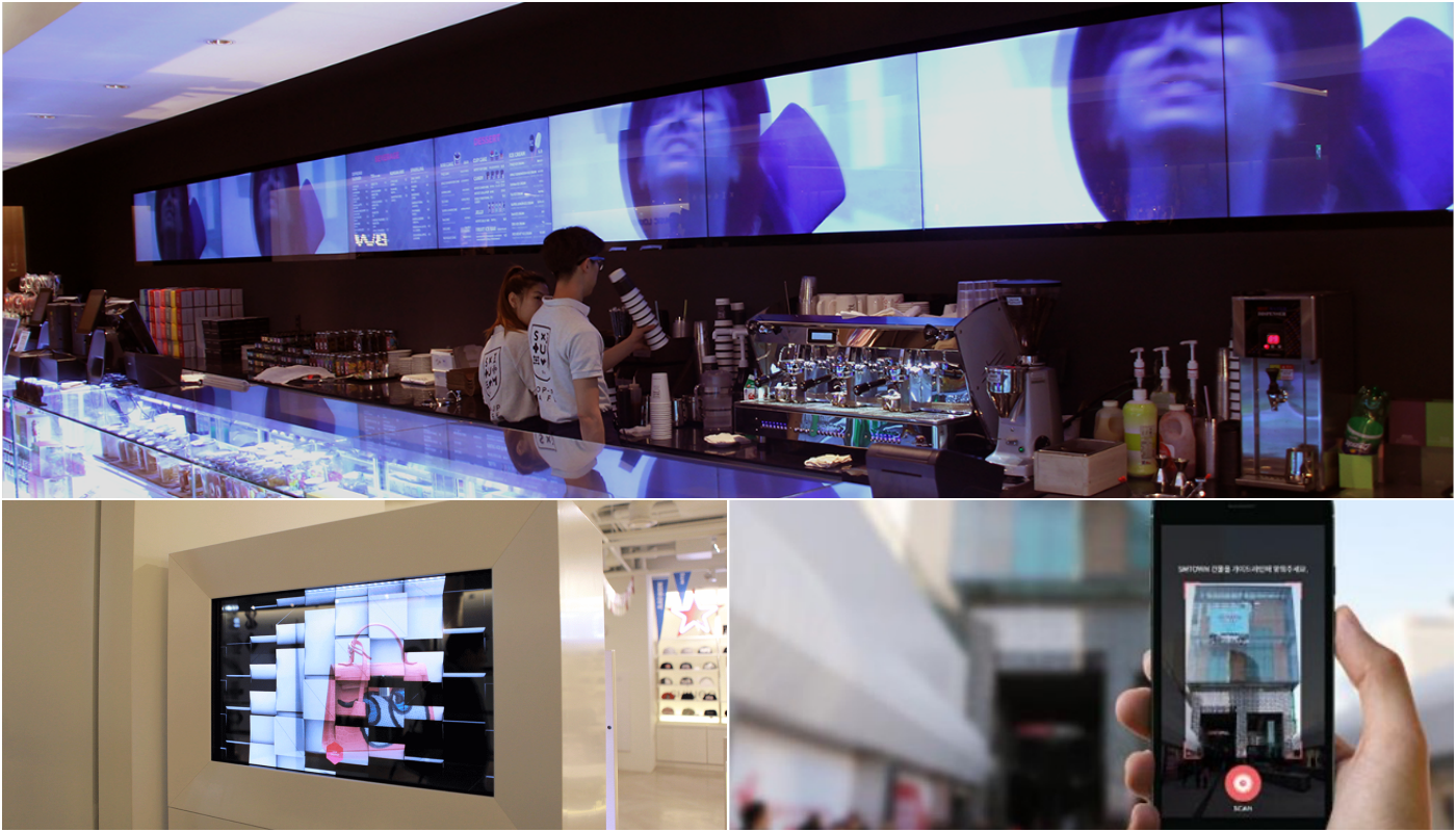 2층, 스타들의 제품을 구매할 수 공간에 설치된 투명 디스플레이 미디어/ 3층, 실제 연습실 공간에 설치된 홍보영 미디어 / 외부, 고객을 위한 홍보용 AR 컨텐츠를 제작하였습니다.