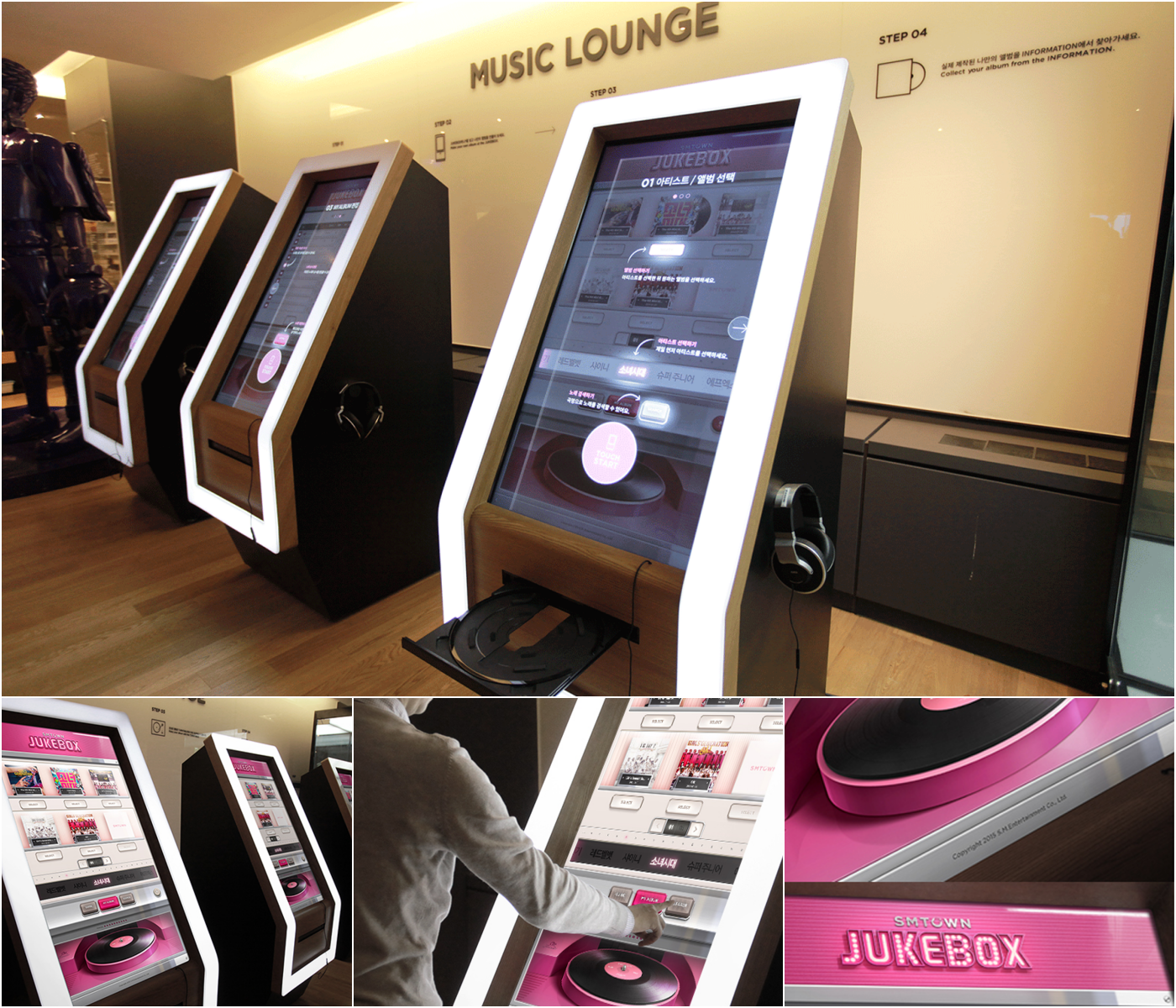 자기만의 앨범을 만들고, 들어보고, 가져갈 수 있는 미디어들로 라운지 공간의 context와 동선을 고려해 자연스런 체험이 가능하게 제작하였습니다.